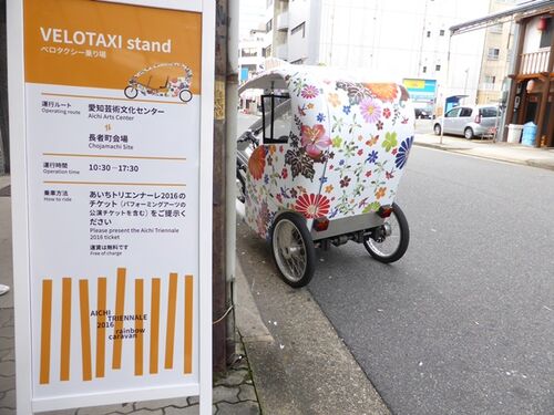 3年ごとに開催されている国際芸術祭あいちトリエンナーレ。 2010年、2013年と開催され今年で3回目とのこと。 県内に会場が点在しているので、何日かにわけてゆっくり鑑賞する予定。 ベロタクシー 環境にやさしい三輪車の自転車のタクシー。 名古屋市中区の長…