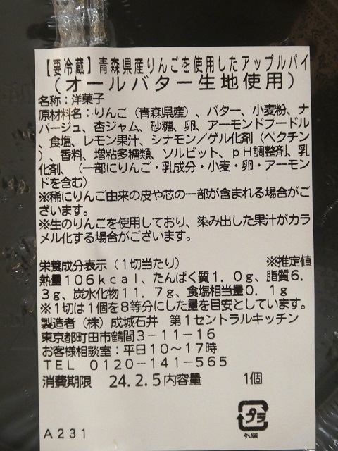 2024-02-07 成城石井 青森県産りんごを使用したアップルパイ ◎お買いもの #菓子・デザート #洋菓子 #成城石井 先日、成城石井でおいしそうなものを物色してきた。 青森県産りんごを使用したアップルパイ 755円 オールバター生地使用がポイント。 皮付きの薄切りのりんごがいっぱい重ねてある。 トースターで焦げ目が付かない程度に軽めに焼き直していただいた。 リンゴはレモンの酸味がしっかり効いている。 おいしかった。 ごちそうさまでした。
