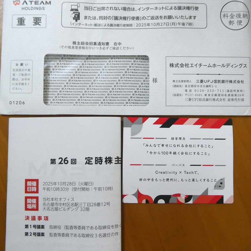 株主総会招集通知、期末配当金計算書とともに株主優待が届いた。